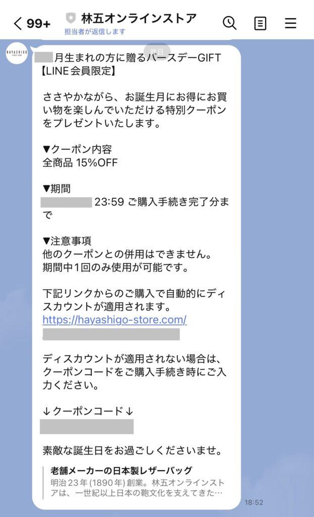 HAYASHIGO(ハヤシゴ)のLINEアンケートに答えた方は、アンケートで回答した誕生日月に誕生日クーポンが届きます。