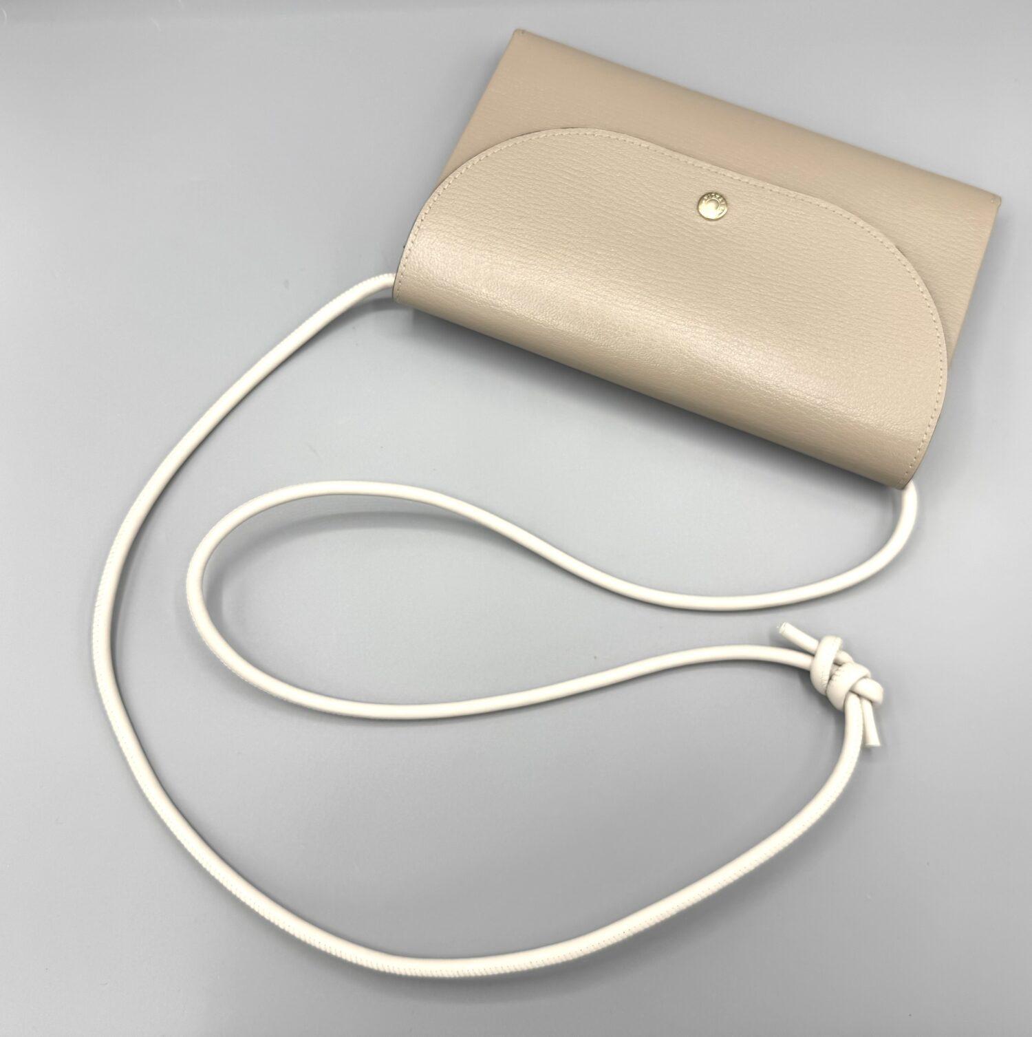 ショルダーストラップは、レザー製の白いドローコードタイプです。