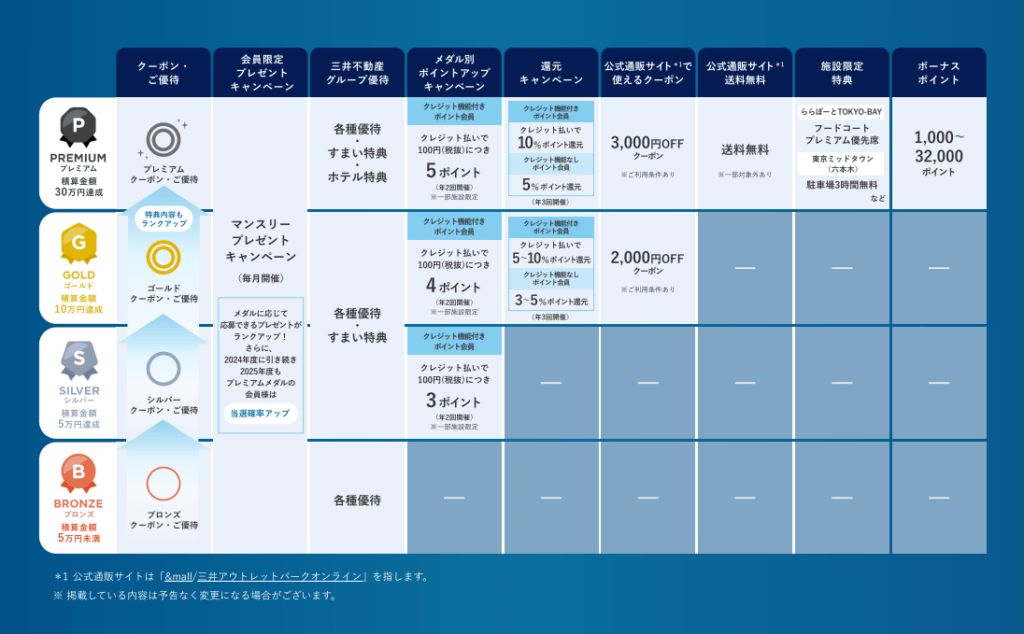 &mallや三井アウトレットパークオンラインでの利用額も、この年間利用額に加算されるため、オンライン中心で買い物をするユーザーでもランクアップを狙いやすいのがポイントです。