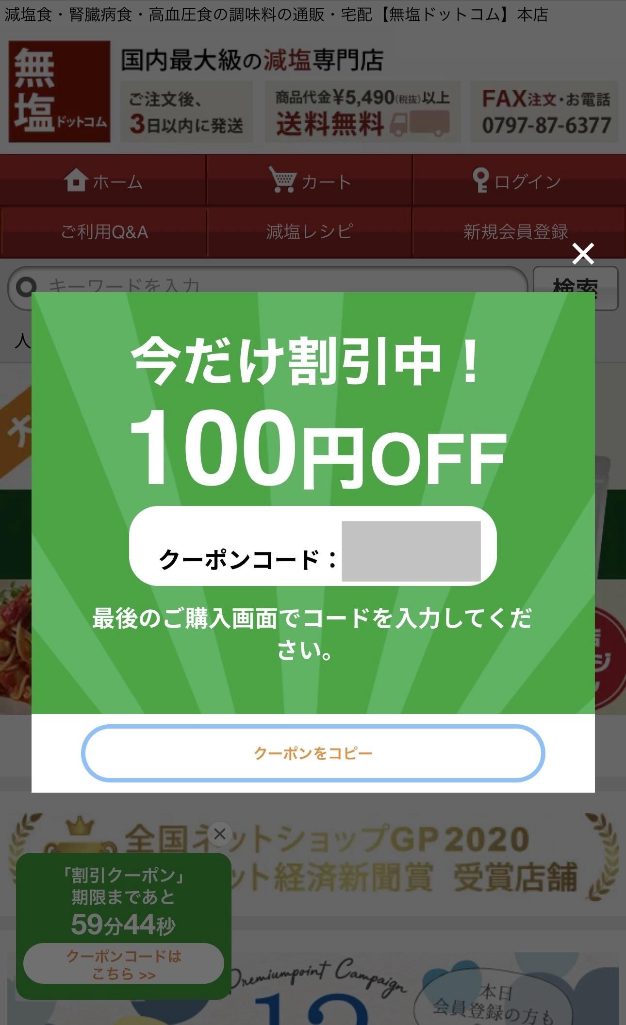 無塩ドットコム公式通販にスマホからアクセスすると、ポップアップ画面でクーポンが出現することがあります。